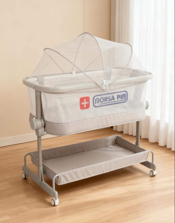 Fabrics: 14000 Twill peach skin rhombus cotton, carbon steel, six upgrades. The bottom bracket can slide left and right to adjust the spliced large bed, sponge urine-isolating mattress + mosquito net + storage rail